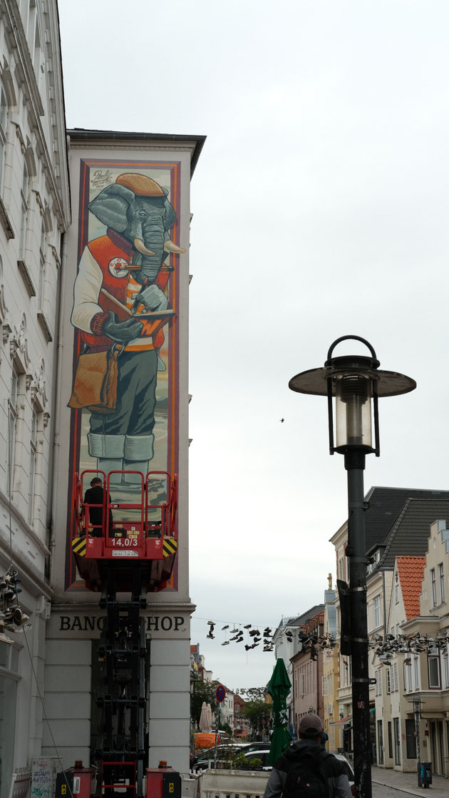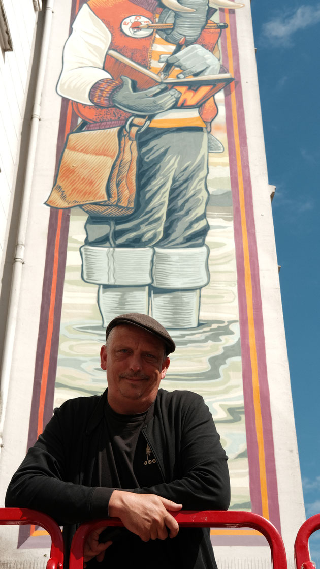 Das Fassadenbild mit dem Titel „Die Schwiegermutter“ stellt das Meer/die Förde in seinen Mittelpunkt. Auf einem Plakat wählt der Künstler die prägnante Figur der sogenannten Schwiegermutter und stellt sie in die Mitte der Komposition. Bei seiner Recherche wird er von Flensburger Seglern inspiriert, diese Fahrwassertonne zu wählen. In der illustrierten und teils zeichnerischen Darstellung findet abgesetzt ein Schweinswal im Vordergrund seinen Platz. Die Verbindung zum Festival findet sich durch die ansässige Künstlerin Melina Grasso, die ihn bei seiner Arbeit tatkräftig unterstützt.