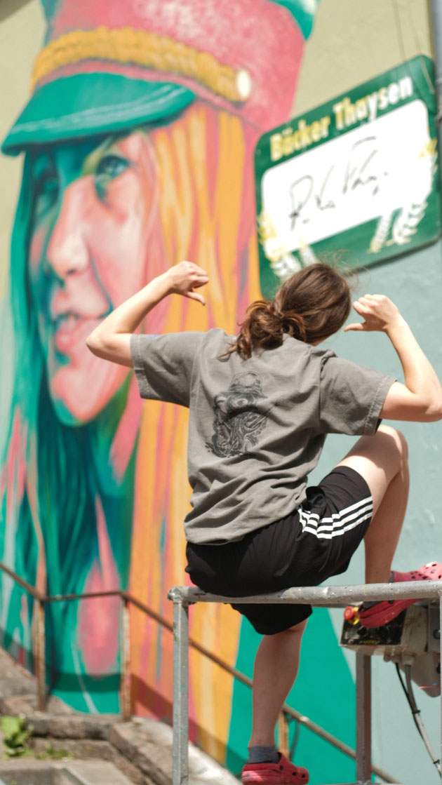 Myra und ich haben eine lange Geschichte. Sie hat mit 9 Jahren bei meinem Mentor Philipp von Zitzewitz einen Workshop gemacht, hat dann 5 Jahre nichts mit der Sprühdose am Hut gehabt. Dann kam